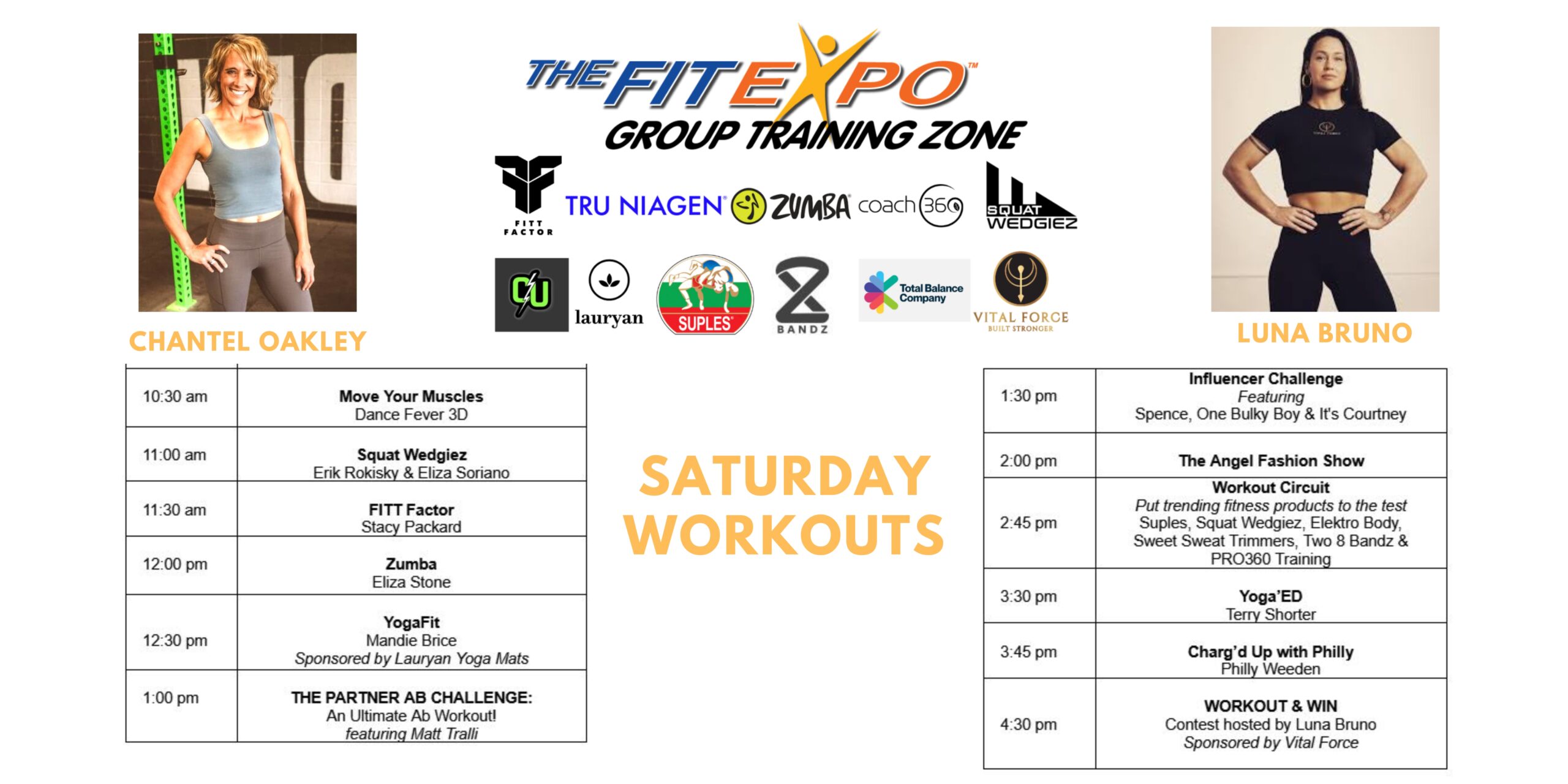 An impressive list of celebrity trainers, influencers & brand ambassadors will rock the stage from opening to close both Saturday and Sunday: